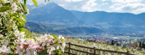 Der Obermaorhof liegt etwas abseits von Meran, umgeben von Obst- und Weingärten, am Rand des bekannten Naturparks Texelgruppe.